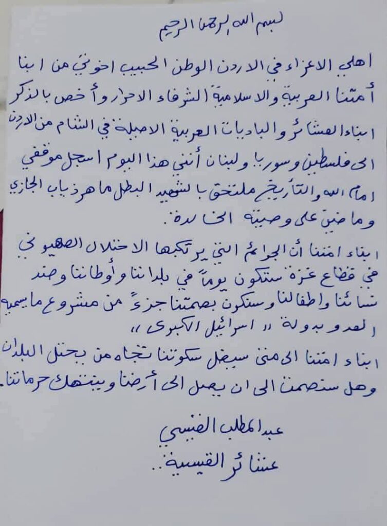 دیروز شهید عبدالمطلب القیسی از اهل سنت اردن علملیات استشهادی گذرگاه کرامه را انجام داد که طی آن چند صهیونیست سکولار به هلاکت رسیدند. وصیت نامه ی این مجاهد استشهادی پیام بزرگی برای اهل سنت و تمام مسلمین جهان در برداشت که هر مسلمانی را تفکر وامیدارد، آنجا که می گوید: